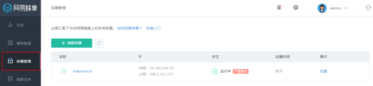 容器管理入口位于网易蜂巢首页的容器管理选项,点击「容器管理」,显示当前用户的所有容器列表。