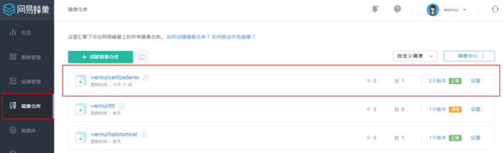 创建的自定义镜像可通过左侧的镜像仓库导航菜单查看。创建的自定义镜像如下图所示:
