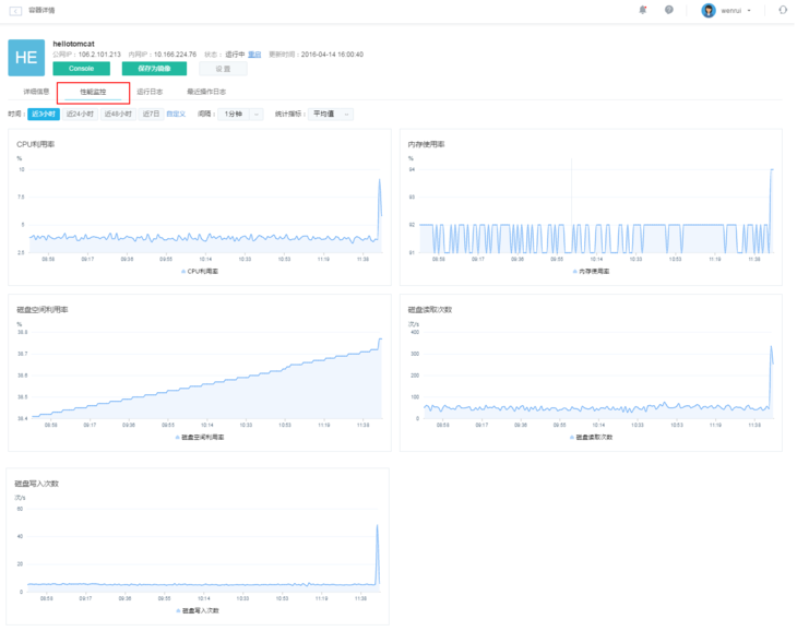 在容器详情页面,点击「性能监控」标签,展示了相应容器的性能监控详情。性能监控主要针对 CPU 利用率、内存利用率、磁盘空间利用率、磁盘读写次数进行监控,实时显示当前容器的 CPU 利用率及内存使用大小,如下图所示。