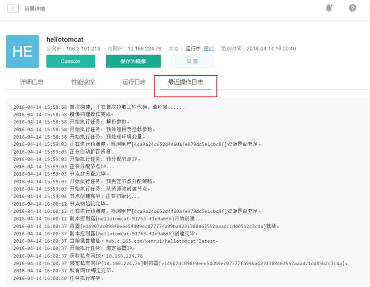 在容器详情页面,点击「最近操作日志」标签,将会显示该容器最近的操作日志,创建、设置等操作都会有相应日志产生,具体如下图所示: