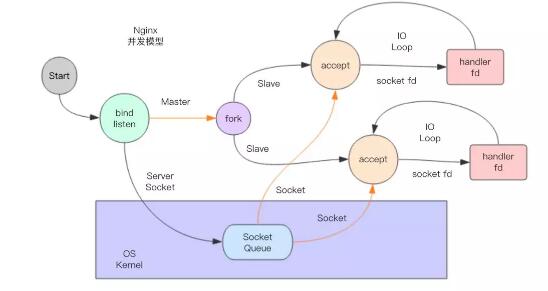 我们知道 Nginx 的并发模型是一个多进程并发模型,它的 Master 进程在绑定监听地址端口后 fork 出了多个 Slave 进程共同竞争处理这个服务端套接字接收到的很多客户端连接。