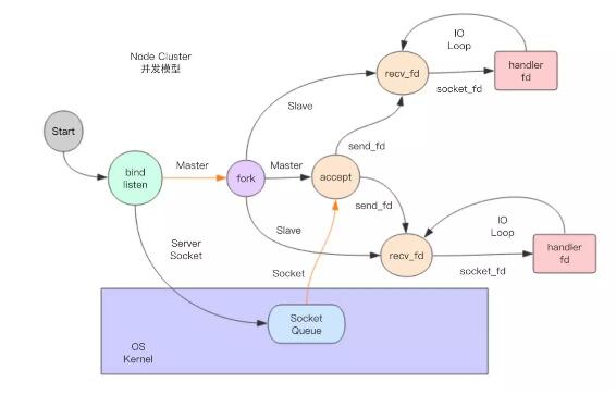 Node Cluster 为了解决负载均衡问题,它采用了不同的策略。它也是多进程并发模型,Master 进程会 fork 出多个子进程来处理客户端套接字。但是不存在竞争问题,因为负责 accept 套接字的只能是 Master 进程,Slave 进程只负责处理客户端套接字请求。那就存在一个问题,Master 进程拿到的客户端套接字如何传递给 Slave 进程。