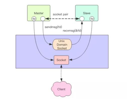 这时,神奇的 sendmsg 登场了。它是操作系统提供的系统调用,可以在不同的进程之间传递文件描述符。sendmsg 会搭乘一个特殊的「管道」将 Master 进程的套接字描述符传递到 Slave 进程,Slave 进程通过 recvmsg 系统调用从这个「管道」中将描述符取出来。这个「管道」比较特殊,它是 Unix 域套接字。普通的套接字可以跨机器传输消息,Unix 域套接字只能在同一个机器的不同进程之间传递消息。同管道一样,Unix 域套接字也分为有名套接字和无名套接字,有名套接字会在文件系统指定一个路径名,无关进程之间都可以通过这个路径来访问 Unix 域套接字。而无名套接字一般用于父子进程之间,父进程会通过 socketpair 调用来创建套接字,然后 fork 出来子进程,这样子进程也会同时持有这个套接字的引用。后续父子进程就可以通过这个套接字互相通信。
