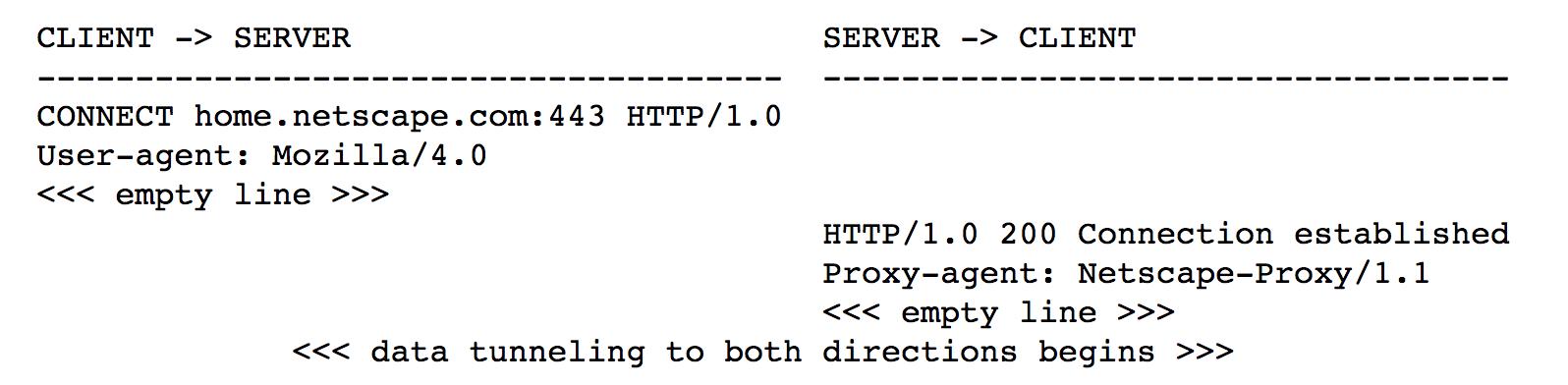 早在1998年,也就是TLS还没有正式诞生的SSL时代,主导SSL协议的Netscape公司就提出了关于利用web代理来tunneling SSL流量的INTERNET-DRAFT。其核心思想就是利用HTTP CONNECT请求在客户端和代理之间建立一个HTTP CONNECT Tunnel,在CONNECT请求中需要指定客户端需要访问的目的主机和端口。Draft中的原图如下: