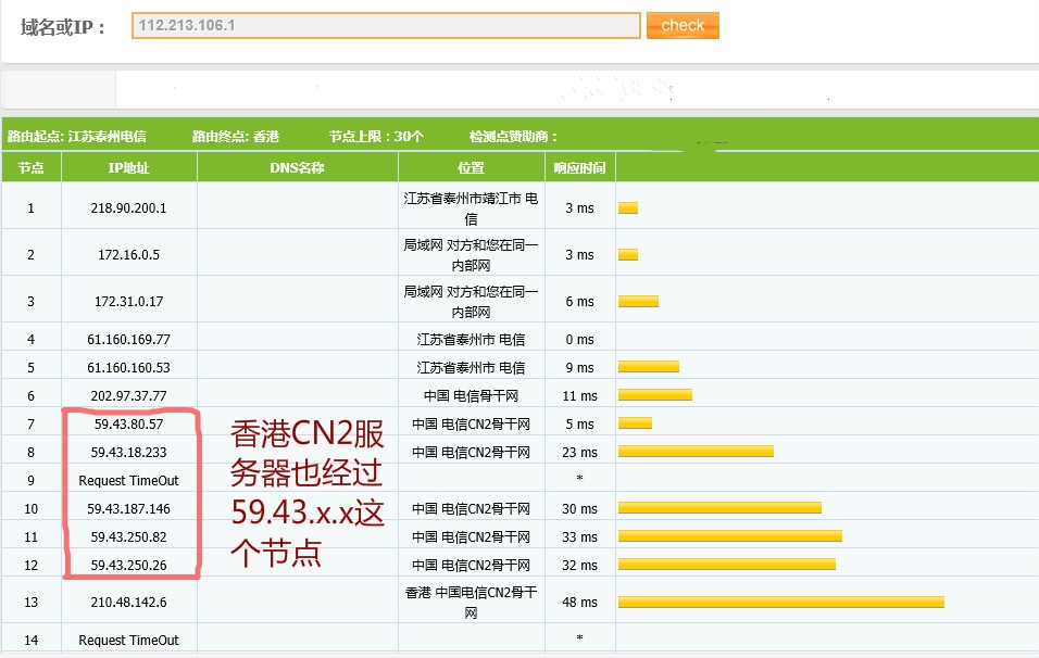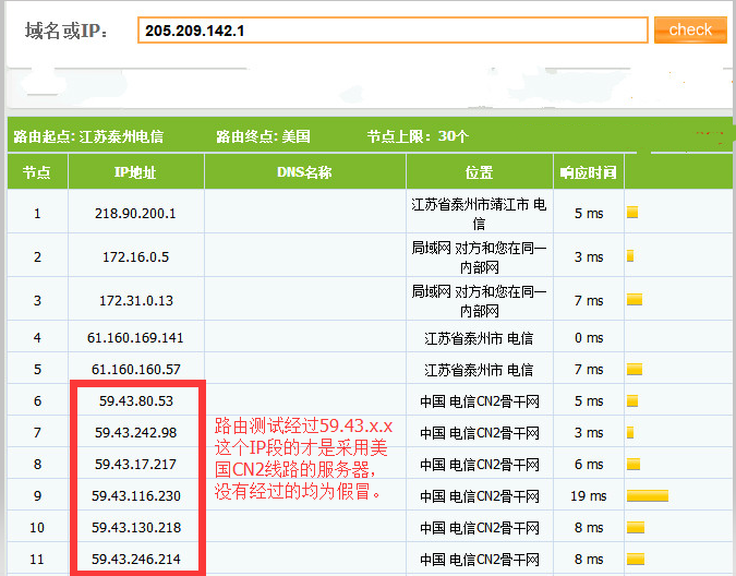 这两种机房的CN2线路都有一个特点,那就是经过路由测试的时候,都会查到经过59.43.x.x的节点(如下图)。所以如果你租用的香港服务器和美国服务器如果没有经过59.43.x.x这些节点,那么你的服务器很有可能不是CN2线路服务器。