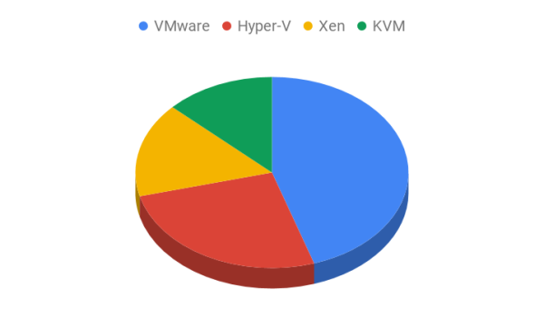 毫无疑问,VMware拔得头筹,Hyper-V和Xen分列第二与第三,而KVM的普及率并不高。
