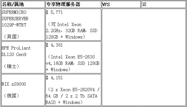 下面让我们比较一下,不同的提供商对于各种物理硬件及服务的报价: