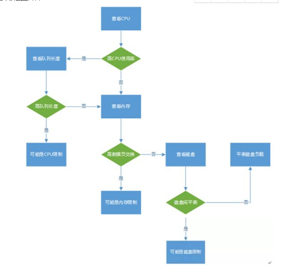 Linux服务器分段排查的方法,按照CPU、内存、磁盘IO、网络的先后顺序依次排除。参考流程图如下: