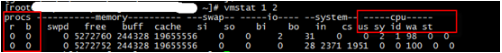 us, sy, id, wa, st:这些都代表了CPU时间的消耗,它们分别表示用户时间(user)、系统(内核)时间(sys)、空闲时间(idle)、IO等待时间(wait)和被偷走的时间(stolen,一般被其他虚拟机消耗)。上述这些CPU时间,可以让我们很快了解CPU是否出于繁忙状态。一般情况下,如果用户时间和系统时间相加非常大,CPU出于忙于执行指令。如果IO等待时间很长,那么系统的瓶颈可能在磁盘IO。
