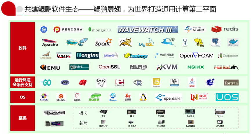 值得注意的是,鲲鹏的基础生态也已经相当完善,特别是与开发者关系较为密切的主流技术基本都支持,比如 Web 支持 Nginx、Apache、Tomcat,中间件支持 Memcached、Redis、Kafka,数据库支持 MySQL、Mariadb、PostgreSQL,大数据支持 Hadoop、Hive、HBase,开发语言支持 Go,C/C++,Java,Ruby、Perl、Python,JavaScript 等,操作系统支持 openEuler、Ubuntu、CentOS、中标麒麟 、UOS 等。