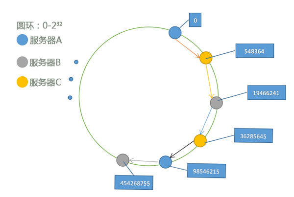 1.用一定的哈希算法(哈希函数等)将一组服务器的多个(数目自己设定)节点随机映射分散到0-232之间,由于其随机分布,保证了其数据平均分布的特点;