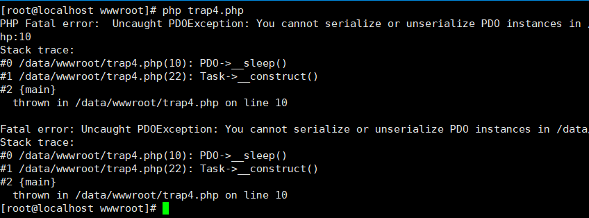 - //注意这里会报错,不能对PDO实例进行序列化或反序列化