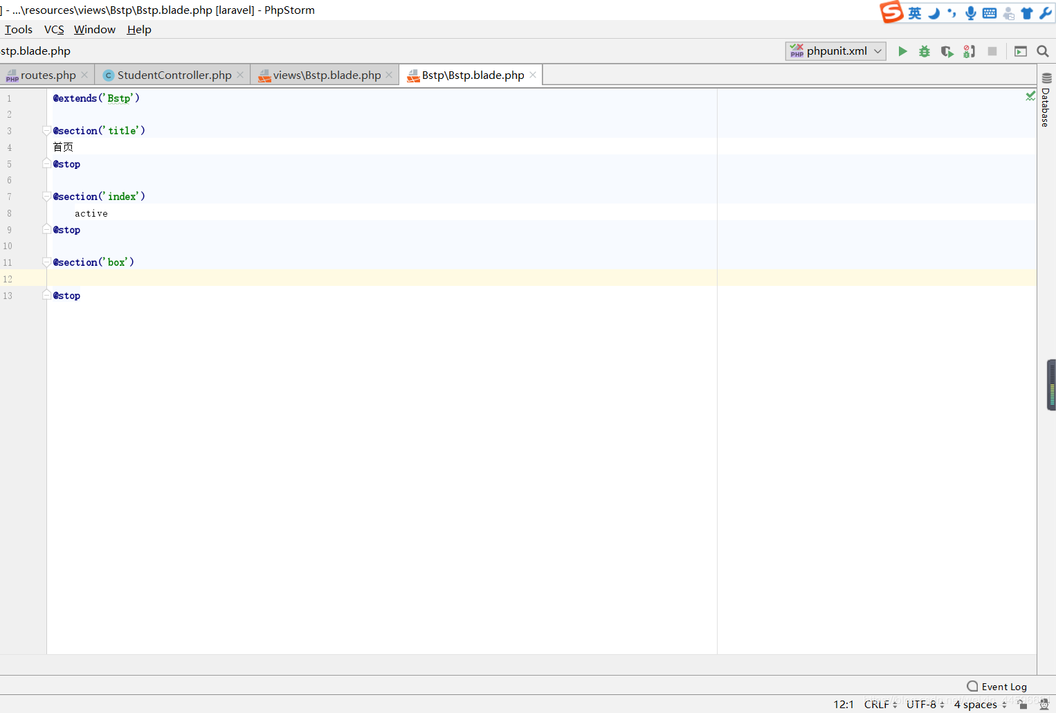 这个代表着,你这个子模板继承于谁,我这里写的是这个子模板继承于view目录下的Bstp.blade.php。