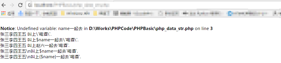 echo "张三李四王五\\n叫上{$name}一起去'喝酒'." ;