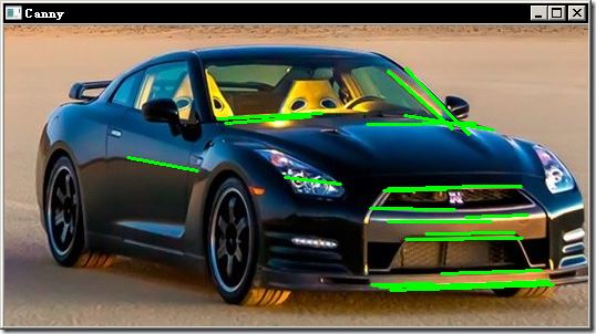 从这个函数的输出结果我们可以看出,得到的直线并没有指定在图像中的开始点与结束点,需要我们自己去计算,如果我们想把直接显示在图像中就会比较麻烦,而且会有很多角度接近的直线,其实它们是重复的,为了解决上面这些问题,OpenCV又提供了一个函数HoughLinesP()。它的输出是一个Vector of Vec4i。Vector每一个元素代表一条直线,是由一个4元浮点数组构成,前两个点一组,后两个点一组,代表了在图像中直线的起始和结束点。