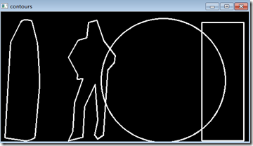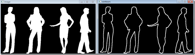 上面程序中包含了2个函数,第一个是查找轮廓函数,它的第三个参数说明查找轮廓的类型,这里我们使用的是外轮廓,还可以查找所有轮廓,即包括一些孔洞的部分,像图像人物胳膊与腰间形成的轮廓。第4个参数说明了轮廓表示的方法,程序中的参数说明轮廓包括了所有点,也可以用其他参数让有点直线的地方,只保存直线起始与终点的位置点,具体参数用法可以参考手册里函数的介绍。
