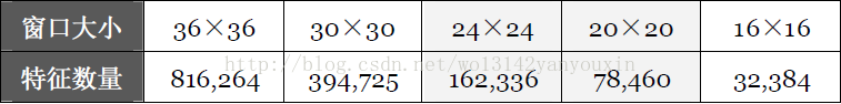 下面列出了,在不同子窗口大小内,特征的总数量:
