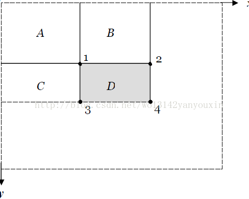 区域 D 的像素和可以用积分图计算为: K1+K4 – (K2+K3)