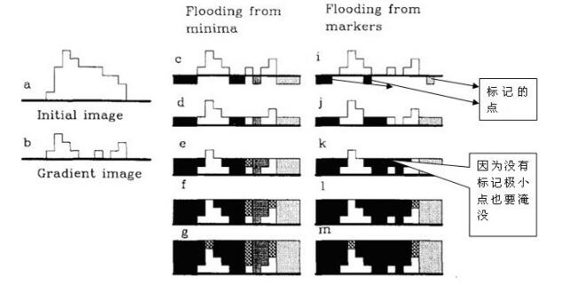 因为传统分水岭算法存在过分割的不足,OpenCV提供了一种改进的分水岭算法,使用一系列预定义标记来引导图像分割的定义方式。使用OpenCV的分水岭算法cv::wathershed,需要输入一个标记图像,图像的像素值为32位有符号正数(CV_32S类型),每个非零像素代表一个标签。它的原理是对图像中部分像素做标记,表明它的所属区域是已知的。分水岭算法可以根据这个初始标签确定其他像素所属的区域。传统的基于梯度的分水岭算法和改进后基于标记的分水岭算法示意图如下图所示。