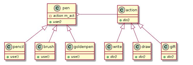上面例子简单的说明了实体类pen和操作类action之间的桥接关系,如果需要扩展的情况下,我们可以分别对pen和action进行继承扩展,不会牵扯到另外一边的改动。比如我们再扩展一种笔或者一种笔的用法,直接扩展笔的种类或者用法的种类即可,这样就达到了低耦合易扩展的目的。