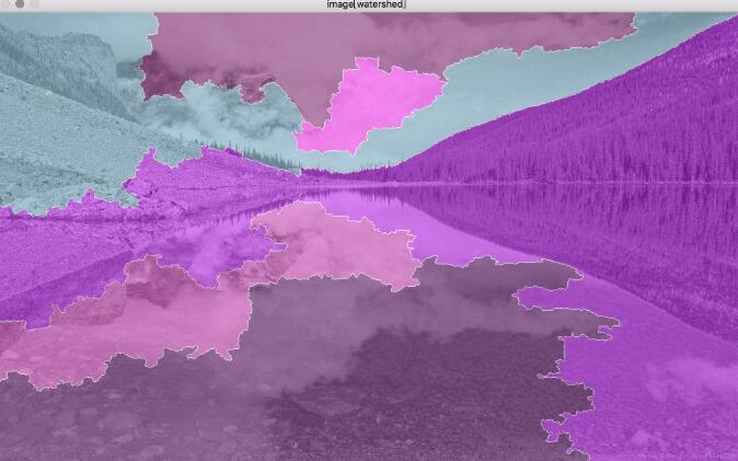简而言之,分水岭算法首先计算灰度图的梯度,这对图像中的“山谷”或没有纹理的“盆地”(亮度值低的点)的形成是很有效的,也对“山头”或图像中有主导线段的“山脉”(山脊对应的边缘)的形成有效。然后开始从用户指定点(或者算法得到点)开始持续“灌注”盆地直到这些区域连成一片。基于这样产生的标记就可以把区域合并到0一起,合并后的区域又通过聚集的方式进行分割,好像图像被“填充”起来一样。