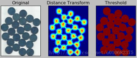 如结果所示,在阈值化之后的图像中,我们得到了肯定是硬币的区域,而且硬币之间也被分割开了。(有些情况下你可能只需要对前景进行分割,而不需要将紧挨在一起的对象分开,此时就没有必要使用距离变换了,腐蚀就足够了当然腐蚀也可以用来提取肯定是前景的区域。)