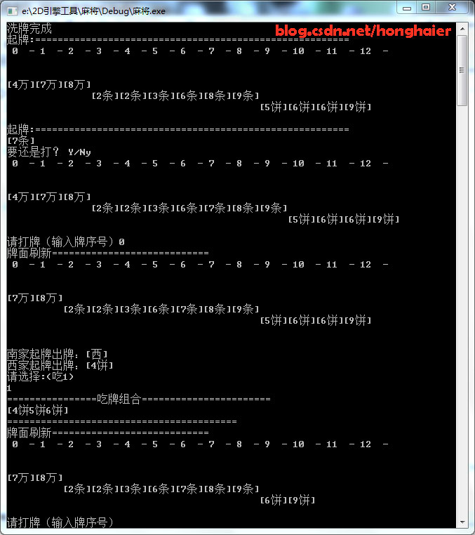 麻将是一种大家最喜爱的娱乐活动之一,相信所有人都有接触过。我写的这版算法,是可以吃,碰,杠,还有把牌摸完没有人胡时的皇庄和包听。是用控制台方式来表现的,什么?控制台?