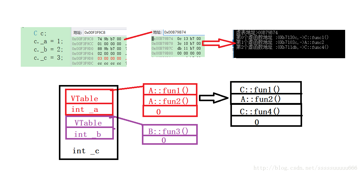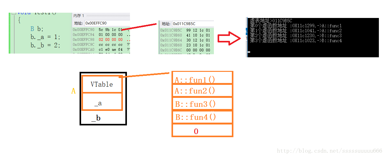 将内存中的显示和我们写的显示虚函数表对应起来如下: