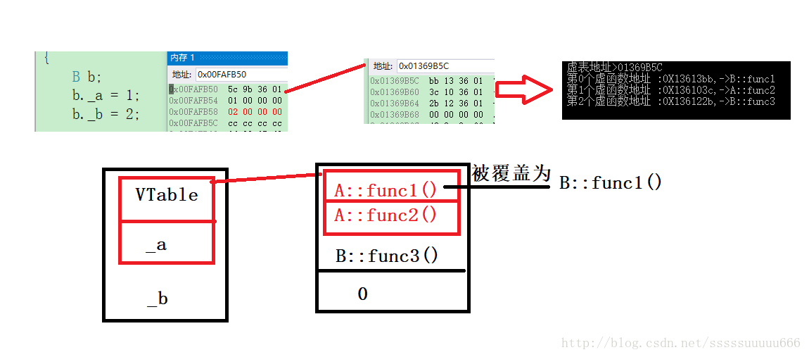 3)覆盖的func()函数被放到了虚表中原来父类虚函数的位置;