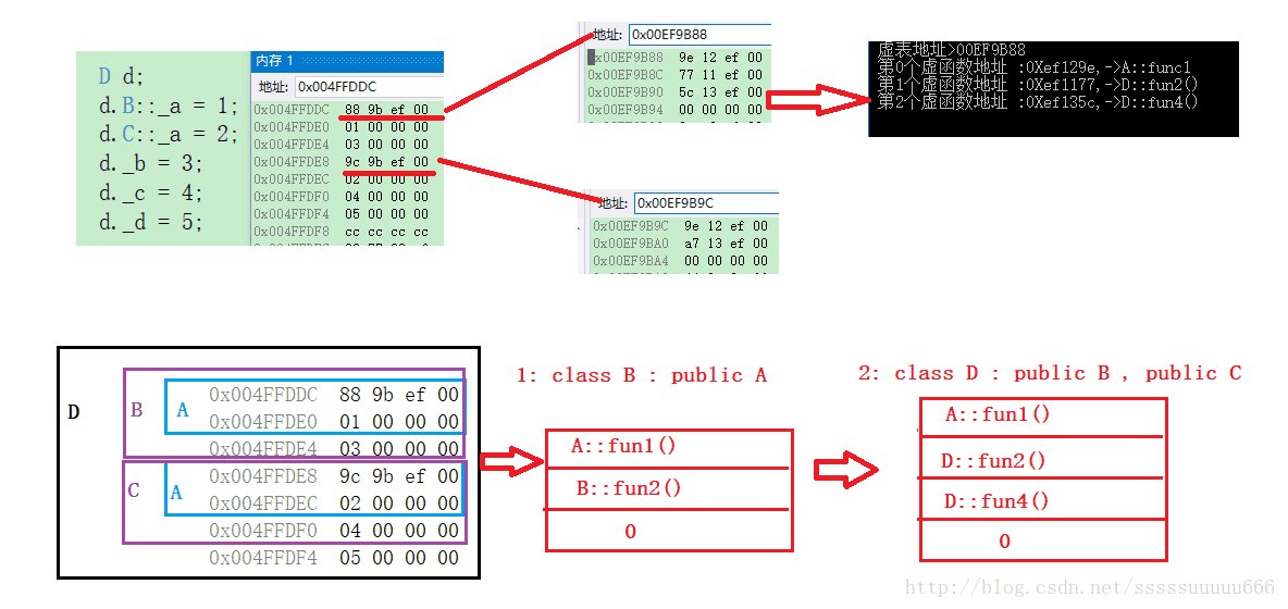由于子类B继承父类A,所以B与A公用一个虚函数表,又因为B是D多继承中的第一个继承的类,所以B,D共用一个虚函数表。