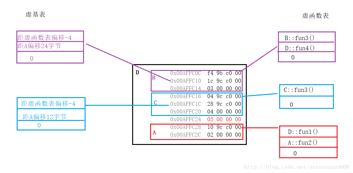 注:由于B,C是虚继承A,所以编译器为了解决菱形继承所带来的“二义性”以及“数据冗余”,便将A放在最末端,并在子类中存放一个虚基表,方便找到父类;而虚基表的前四个字节存放的是对于自己虚函数表的偏移量,再往下四个字节才是对于父类的偏移量。