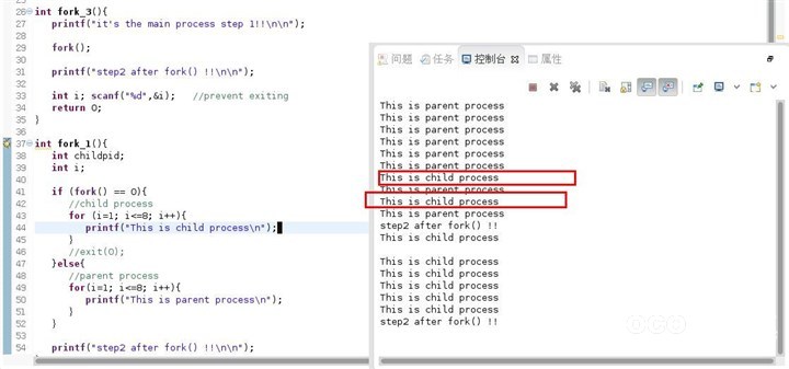 我对fork() 函数的返回值进行了判断, 如果 返回值是0, 我就让认为它是子进程, 否则是主程序. 那么我就可以让这两条进程输出不同的信息了.