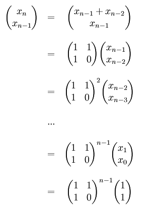 如上图,Fibonacci 数列中任何一项可以用矩阵幂算出,而n次幂是可以在logn的时间内算出的。