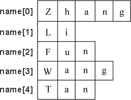 在定义字符串数组时怎样给数组分配存储空间呢?实际上,编译系统为每一个字符串变量分配4个字节,在这个存储单元中,并不是直接存放字符串本身,而是存放字符串的地址。在本例中,就是把字符串″Zhang″的地址存放在name[0],把字符串″Li″ 的地址存放在name[1],把字符串″Fun″的地址存放在name[2]……上只是一个示意图。在字符串变量中存放的是字符串的指针(字符串的地址)。