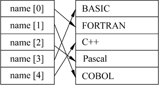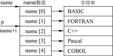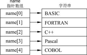 char *name[]={ "BASIC" , "FORTRAN" , "C++" , "Pascal" , "COBOL" }; //定义指针数组