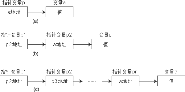 在本章开头已经提到了“间接访问”一个变量的方式。利用指针变量访问另一个变量就是“间接访问”。如果在一个指针变量中存放一个目标变量的地址,这就是“单级间址”,见图6.24(a)。指向指针的指针用的是“二级间址”方法。见下图。从理论上说,间址方法可以延伸到更多的级,见下图。但实际上在程序中很少有超过二级间址的。