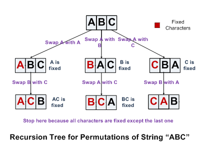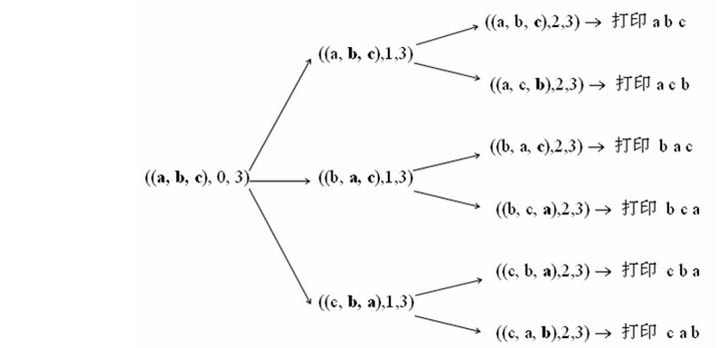- 既然我们已经知道怎么求三个字符的排列,那么固定第一个字符之后求后面两个字符的排列,就是典型的递归思路了
