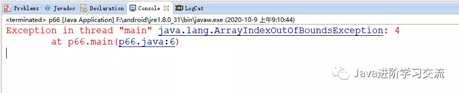 3.数组的下标访问数组元素,当超过数组的下标值就会引起运行异常,我们通过下面的例子看一下: