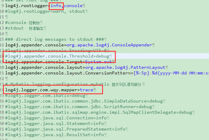 有小伙伴反馈按第二种方法配置后不输出SQL 语句,请注意 log4j.properties 文件中的: