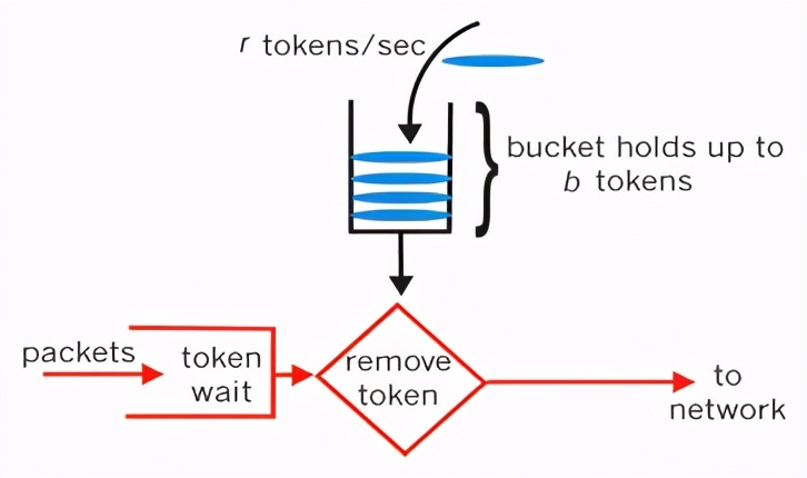 令牌桶算法的原理是系统会以一个恒定的速度往桶里放入令牌,而如果请求需要被处理,则需要先从桶里获取一个令牌,当桶里没有令牌可取时,则拒绝服务。从原理上看,令牌桶算法和漏桶算法是相反的,一个“进水”,一个是“漏水”。