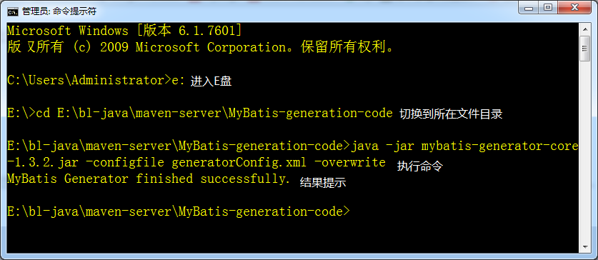 打开控制台,进入目录(我的:e:\\bl-java\\maven-server\\mybatis-generation-code),执行脚本: