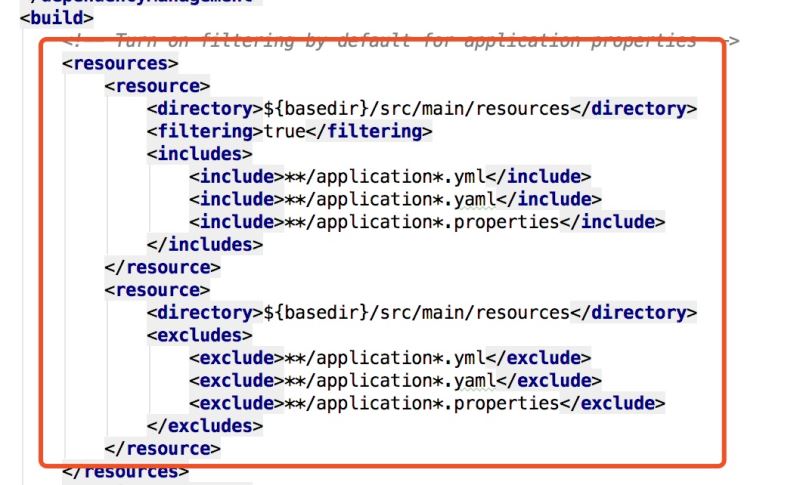 大家可以看到,默认情况下会将/src/main/resources目录下的文件作为资源文件加入到classpath下,另外,这个地方的仅仅对application*.yml,application*.yaml,application*.properties三种文件进行过滤。这个过滤是指什么呢?大家配置过spring mvc的人应该都知道,配置数据库时,我们通常将数据库的信息配置在一个properties文件中,然后在spring的配置文件中通过<property name="driverclass" value="${jdbc.driver}" /> 的形式引入,这个filter的作用就是在编译的时候将配置文件中配置的名值对替换到spring的配置文件中${xxx}字符,但这个功能不是必要的,即使不进行替换,spring也能在运行时读取到配置项。