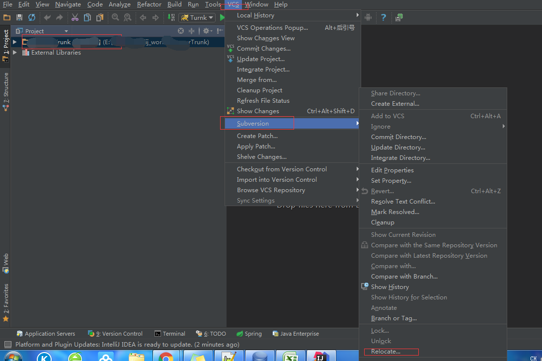 1.就是先关闭ide,重新打开,然后选择svn去设置新的路径。如下图: