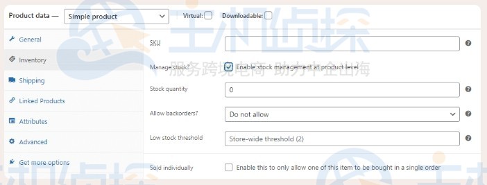 4、如果要管理单个库存设置,则需要选中在产品级别启用库存管理。以下是每个设置的含义: