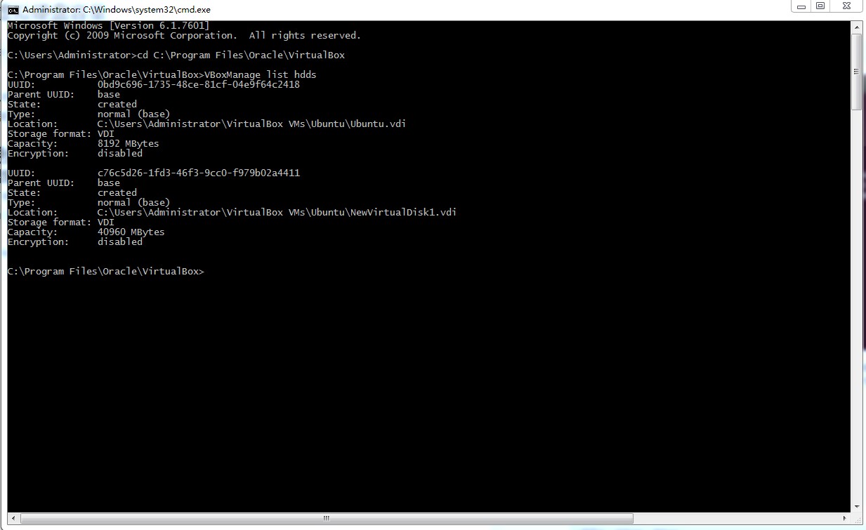 Microsoft Windows [Version 6.1.7601] Copyright (c) 2009 Microsoft Corporation. All rights reserved. C:\\Users\\Administrator>cd C:\\Program Files\\Oracle\\VirtualBox C:\\Program Files\\Oracle\\VirtualBox>VBoxManage list hdds UUID: 0bd9c696-1735-48ce-81cf-04e9f64c2418 Parent UUID: base State: created Type: normal (base) Location: C:\\Users\\Administrator\\VirtualBox VMs\\Ubuntu\\Ubuntu.vdi Storage format: VDI Capacity: 8192 MBytes Encryption: disabled UUID: c76c5d26-1fd3-46f3-9cc0-f979b02a4411 Parent UUID: base State: created Type: normal (base) Location: C:\\Users\\Administrator\\VirtualBox VMs\\Ubuntu\\NewVirtualDisk1.vdi Storage format: VDI Capacity: 40960 MBytes Encryption: disabled