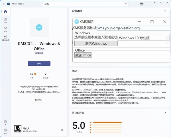 近日,有网友发现,“KMS激活;Windows & Office”已经上架微软商店。而且目前该软件的口碑还不错,因为它获得了满分5分的评价。