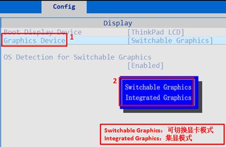3)然后看到“Graphic Device”,其中有两个选项:Switchable Graphics表示可切换显卡模式;Integrated Graphics表示集显模式。选择好后,按F10并根据提示保存退出即可。