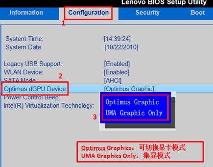 依次选择“Configuration”、“Graphic Device”,其中有两个选项:Optimus表示可切换显卡模式;