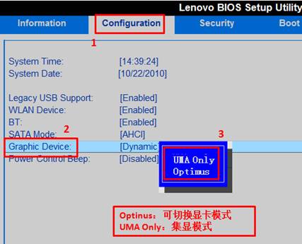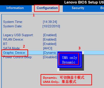 依次选择“Configuration”、“Graphic Device”,其中有两个选项:Switchable Graphics表示可切换显卡模式;UMA Graphics表示集显模式。选择好后,按F10并根据提示保存退出即可。