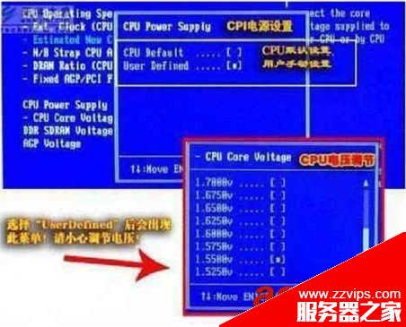 此选项允许用户在处理器预设电压数值和使用者定义电压数值之间做切换,请不要随意去变动此预设电压数值,除非你有一定的调节经验,选择「User Define」选项后“CPU Core Voltage ”就可以选择CPU核心所使用的电压可让您以手动的方式来选择处理器的核心电压数值。 如图: